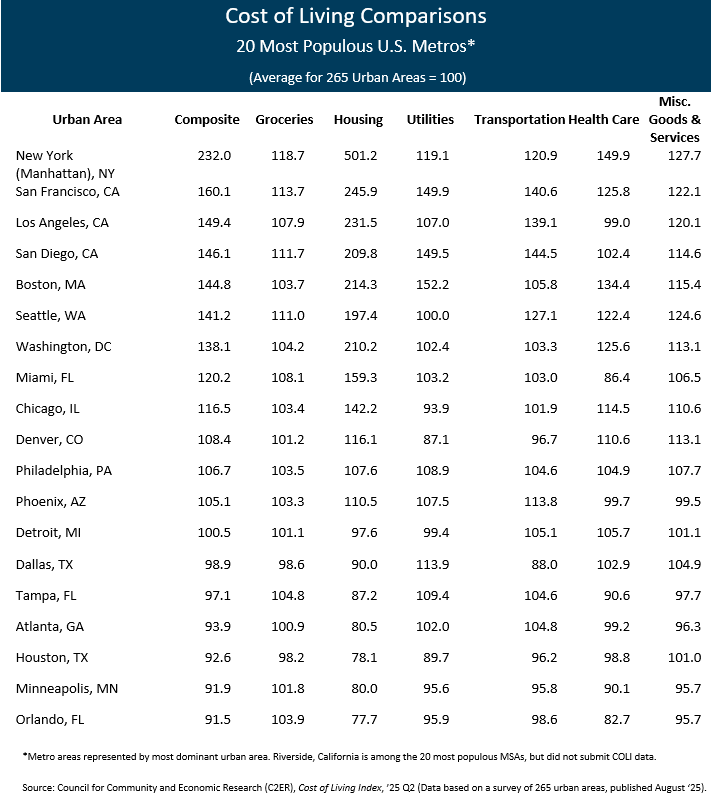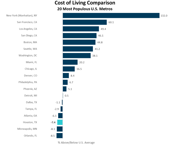 According to the C2ER Cost of Living Index 2025, Houston has the third-lowest living costs among the most populous U.S. metro areas. Houston’s living costs are 7.4 percent below the urban average and 24.0 percent below the average of the nation’s most populous metropolitan areas.