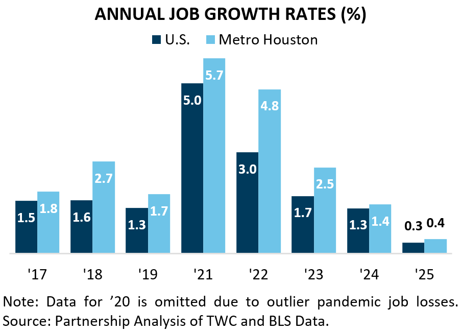 Metro Houston created 14,800 jobs in ‘25. That represents a 0.4 percent job growth rate, which falls below the 1.5 percent average pace of the past decade. The slower pace reflects a broader national slowdown in hiring, which tempered job growth across the United States. Even so, Houston outpaced the rest of the nation for an eighth straight year, with the region’s 0.4 percent job growth rate surpassing the national 0.3 percent. That relative strength speaks to Houston’s solid fundamentals, including its diversified industrial base, large and growing population, and key role in global energy.