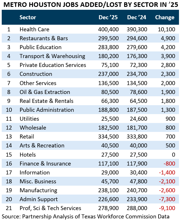 Fourteen of Houston’s 21 major sectors added jobs in ’25. The biggest gains came in health care, restaurants and bars, and public education, followed by solid growth in transportation and warehousing, private education, and construction. These industries, which largely serve the needs of local residents, continued to benefit from a growing population and steady consumer demand.