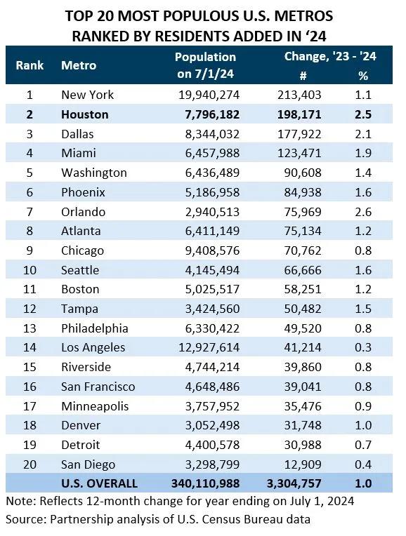 Houston ranked second in the number of residents added in ‘24 behind New York City. It added more residents than Los Angeles, Chicago, and Dallas/Fort Worth, even though they each have larger populations.