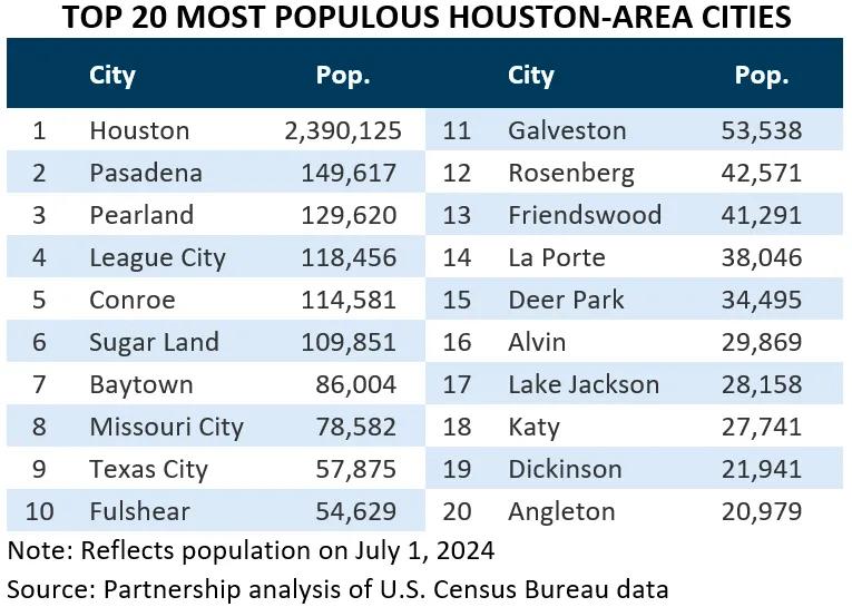 Houston proper is home to 2.4 million people, or approximately 31 percent of all metro residents. Pasadena, Pearland, League City, Conroe, and Sugar Land are each home to more than 100,000 people. Fulshear has grown significantly and overtaken Galveston as the 10th-largest city in the region.