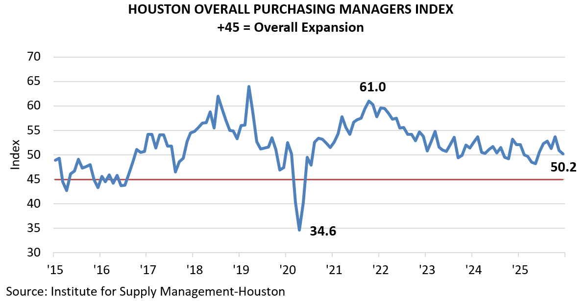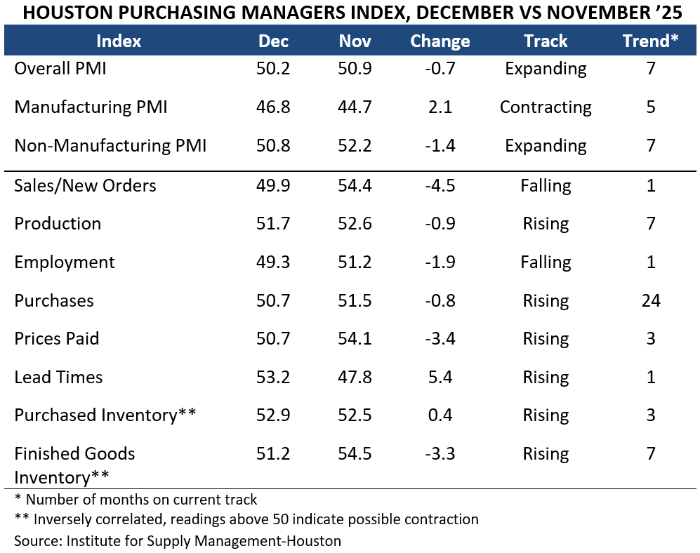 Houston’s economy expanded at a slower pace in December, according to the most recent Houston Purchasing Managers Index (PMI) prepared by the Institute for Supply Management-Houston. The overall PMI, which measures broad economic activity according to a survey of supply chain executives, eased to 50.2 in December from 50.9 in November. Even so, the index remained above the 45-point break-even threshold that signals overall economic expansion. Manufacturing contracted for a fifth consecutive month, while non-manufacturing extended its expansion streak to seven months, though its growth in December was marginal.
