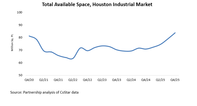 At the end of Q4/25, Houston had 83.7 million square feet of industrial and warehouse space listed as available, up from 81.5 million square feet in Q3/25. This total includes vacant, sublet, and soon-to-be-vacant space, as well as occupied space currently being marketed for lease.