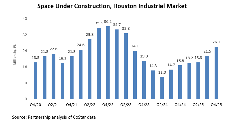 Higher interest rates, tighter lending standards, and softer absorption have slowed building activity in Houston’s industrial market. As of Q4/25, 26.1 million square feet were under construction, reflecting a modest rebound since mid-‘24 but remaining well below the cycle peak of 36.6 million square feet in Q4/22.
