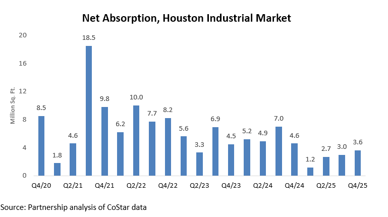 Net absorption in Houston’s industrial market continued to moderate from the elevated levels seen in ’24. In Q4/25, net absorption totaled 3.6 million square feet, up from 3.0 million square feet in Q3/25 but still below the pace recorded earlier in the cycle. The moderation reflects softer tenant demand amid continued new supply additions.