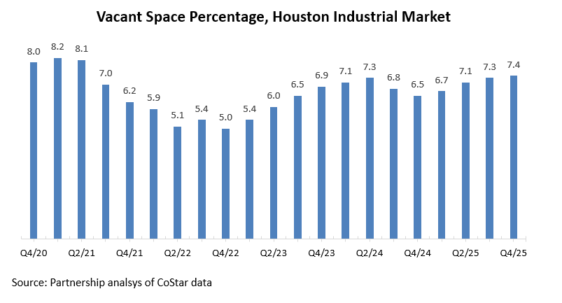 Demand for industrial and warehouse space in Houston has fluctuated over the past several years. The vacancy rate fell to a five-year low of 5.0 percent in Q4/22 amid strong absorption and record construction activity. As new supply continued to outpace demand, vacancy trended upward, reaching a new cycle high of 7.4 percent in Q4/25, edging above the prior peak of 7.3 percent in Q3/25.