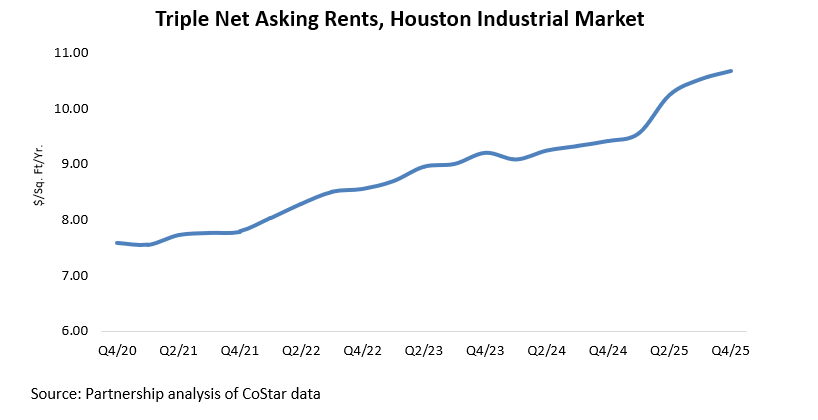 Despite softer absorption, industrial rents in Houston continue to rise. The average triple net (NNN) rent reached $10.67 per square foot in Q4/25, up from $9.41 in Q4/24 and $9.20 in Q4/23. Under NNN lease terms, tenants cover expenses such as property taxes, maintenance, utilities, and security. Over the past five years, rents have increased about 41 percent, underscoring steady demand for quality space even in a more cautious leasing environment.
