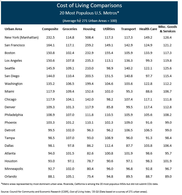 According to the C2ER Cost of Living Index 2025 Q3, Houston has the third-lowest living costs among the most populous U.S. metro areas. Houston’s living costs are 7.0 percent below the national urban average and 24.6 percent below the average of the nation’s most populous metropolitan areas.