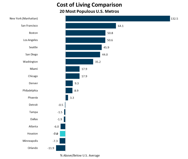 According to the C2ER Cost of Living Index 2025 Q3, Houston has the third-lowest living costs among the most populous U.S. metro areas. Houston’s living costs are 7.0 percent below the national urban average and 24.6 percent below the average of the nation’s most populous metropolitan areas.