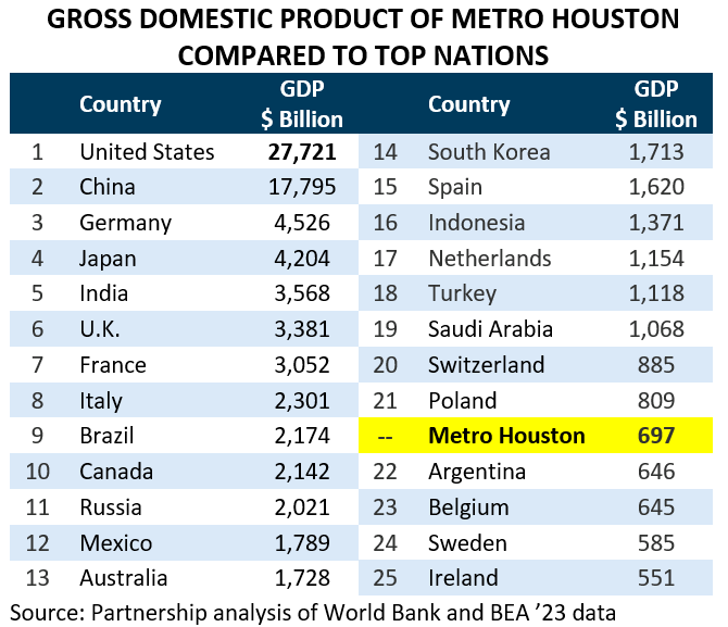 Houston’s economy remains one of the largest and most diverse in the nation. The value of all goods and services produced in metro Houston was valued at $697 billion in ’23. That is more than the value produced by most countries across the globe. In fact, if the region were an independent country, it would have the 22nd most valuable economy in the world, behind Switzerland and Poland, but ahead of countries like Argentina, Belgium, Sweden, and Ireland.