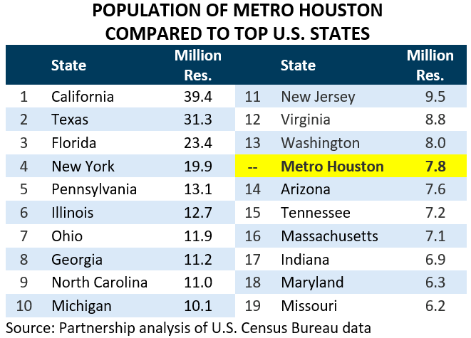 Spanning 8,838 square miles of land, the Houston region is home to 7.8 million people. If it were an independent state it would be the 14th largest in the country ahead of states like Arizona or Tennessee.