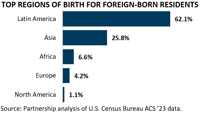 Nearly 1.9 million Houstonians (or roughly one-in-four) were born outside the U.S. Since Houston is so close to Latin America, it should be no surprise that the majority (62.1 percent) were born in that region. But significant swaths were also born in Asia, Africa, Europe, and North America.