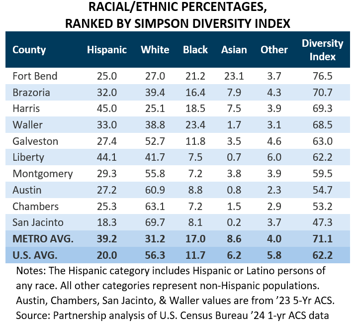 Fort Bend stands out as the region’s most diverse county, as well as one of the most diverse in the nation, with relatively even representation across major racial/ethnic groups. Brazoria ranks second, edging out Harris County, with comparatively larger shares of non-Hispanic White, Asian, and residents belonging to other racial/ethnic groups. These two suburban counties underscore a broader pattern: Much of the region’s growth and diversification is now occurring outside the central core, as suburban communities become increasingly multiethnic – shaped by domestic migration, immigrant settlement, and second-generation households.