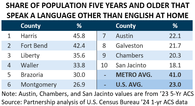 With such a large share of Houston’s population born outside the U.S. its no surprise that much of the population speaks a language other than English at home. In Harris County, that share is nearly twice the national average, while in Fort Bend, Liberty, and Waller, more than one-in-three residents speak a language other than English.
