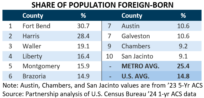 Across metro Houston’s 10 counties, a majority have foreign-born shares above the national average, reflecting how immigrants are integral to the region’s urban core while becoming increasingly central to its fast-growing suburbs.