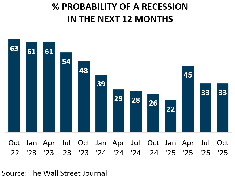 While this trajectory may be slower than what we have become accustomed to in recent years, it still represents forward momentum with relatively low odds of a recession. An October ’25 Wall Street Journal survey of economists puts the probability of a U.S. recession in the next 12 months at 33 percent. That figure is higher than the 22 percent reported in January, but lower than the peak of 45 percent reached in April, when uncertainty over trade policy was at its highest.