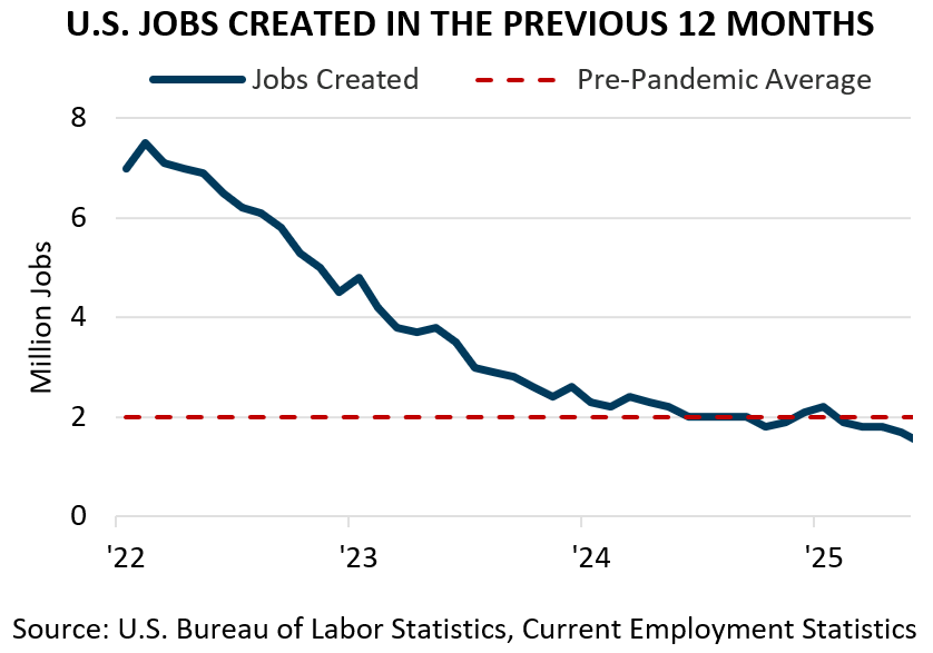 The U.S. labor market has slowed down from the dramatic pace of growth experienced in the immediate pandemic rebound. Between ’21 and ’23, the U.S. added an average of roughly 4.7 million workers each year as the economy went into overdrive to recover lost jobs. By ’24, the job growth rate came back to earth with a more typical 2.1 million jobs added during the year. In ’25, job growth slowed even further, falling below the pre-pandemic trend with just 1.3 million jobs added as the labor market encountered new headwinds.