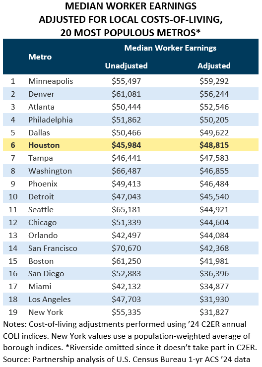 The median worker in Houston earned $45,984 per year in ‘24, placing the region 17th among the nation’s 20 most populous metros. On the surface, that figure suggests the typical Houston worker is worse off than counterparts in most other large metros, but the comparison does not account for regional differences in the cost-of-living.
