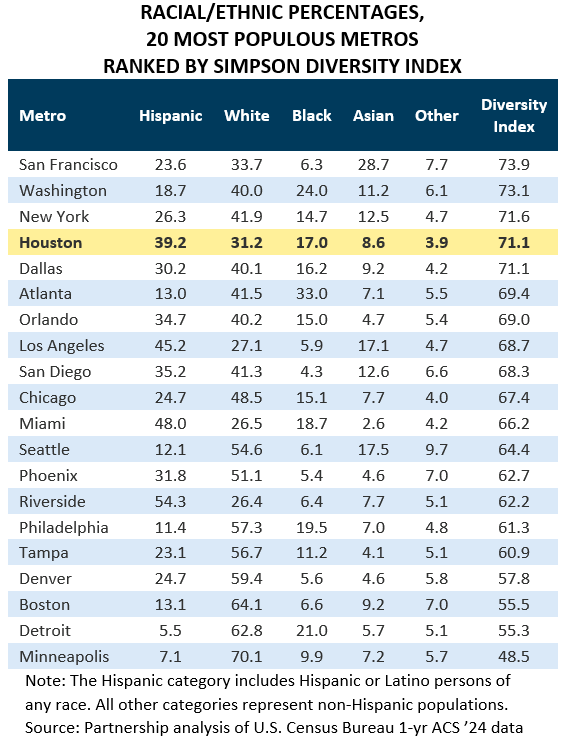 The three metros ranking above Houston are only slightly more diverse. In top-ranked San Francisco, the odds that two random residents belong to different groups are just 2.8 percentage points higher than in Houston.