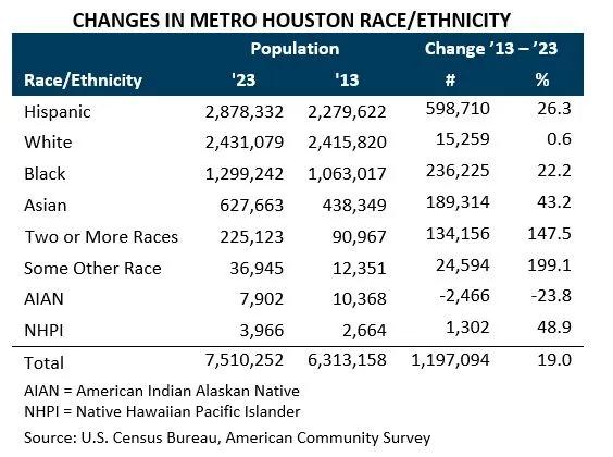 Houston’s Asian, Black, and Hispanic communities have grown substantially over the past 10 years while the white population has remained relatively unchanged. The region has also seen a surge in residents self-identifying as being of more than one race, a trend that is more common than it was a decade ago.