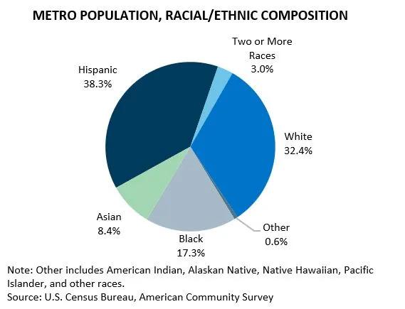 Hispanics comprise the largest racial/ethnic community in the region. However, no single group constitutes a majority of Houston’s population. It’s been that way since the late ’90s.
