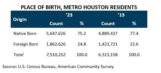 Houston’s foreign-born population grew by more than 435,000 over the decade. Our foreign-born population now exceeds the total populations of 12 states (Alaska, Delaware, Hawaii, Maine, Montana, New Hampshire, North Dakota, Rhode Island, South Dakota, Vermont, West Virginia, Wyoming) and the District of Columbia.
