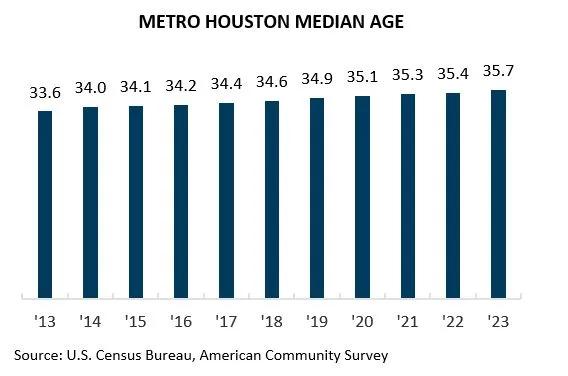 Houston has grown older. In ’13, the region’s median age was 33.6 years. In ’23, the median was 35.7. By comparison, the median for the U.S. was 39.0 last year.
