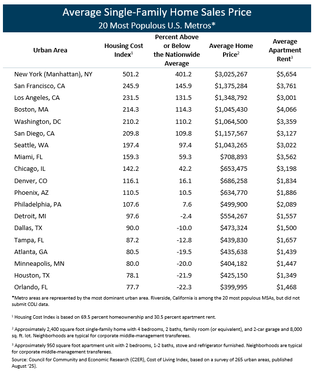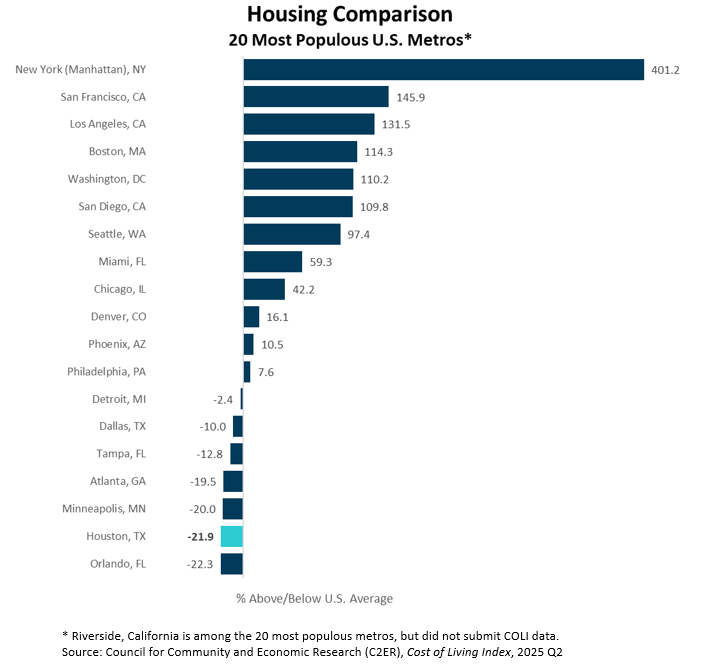 At 21.9 percent below the national urban average, Houston’s housing costs are the second lowest among the most populous U.S. metros, according to the C2ER Cost of Living Index 2025. Furthermore, housing costs in Houston are 51.1 percent below the average of the most populous U.S. metros. (This housing index is based 69.5 percent on homeownership and 30.5 percent on rental occupancy).