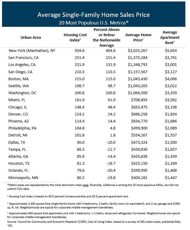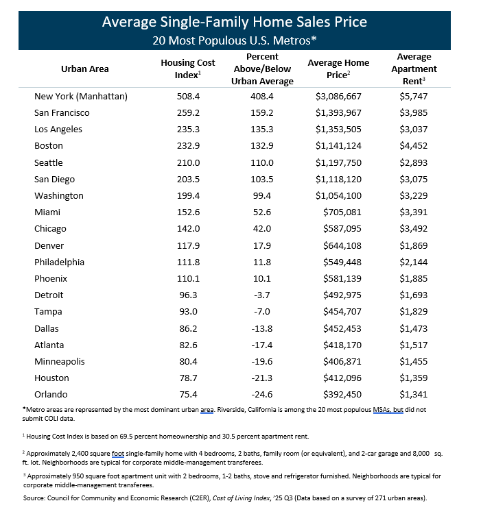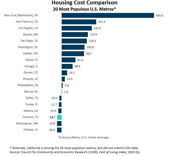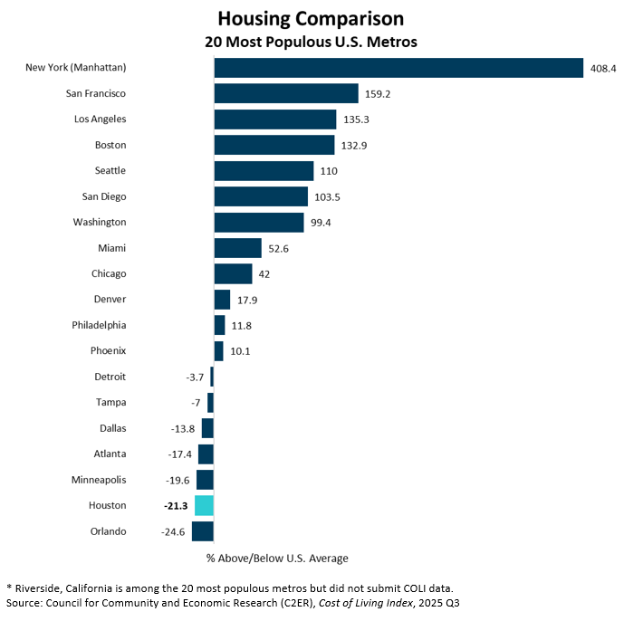 At 21.3 percent below the national urban average, Houston’s housing costs are the second lowest among the most populous U.S. metros, according to the C2ER Cost of Living Index Q3 2025. Furthermore, housing costs in Houston are 51.4 percent below the average of the most populous U.S. metros. (This housing index is based 69.5 percent on homeownership and 30.5 percent on rental occupancy).