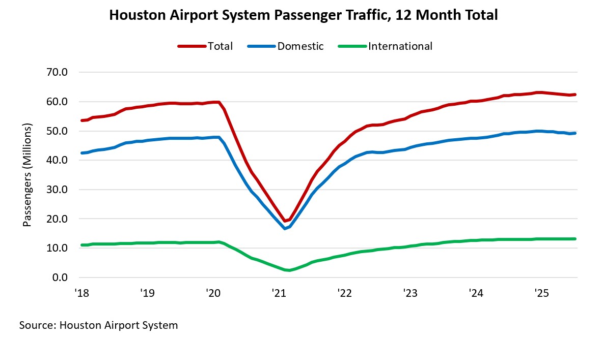 The Houston Airport System (HAS) handled 62.4 million passengers in the 12 months ending July ’25. That represents a 0.5 percent increase over the 62.1 million handled during the same period last year and a continued improvement over pre-pandemic levels of travel. Domestic and international travel accounted for 49.2 million and 13.2 million passengers, respectively.