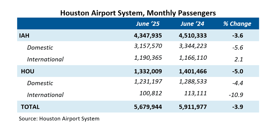 Travel was also up year over year for the month of July, growing 3.4 percent from July ‘24. Domestic travel was up 2.0 percent to 4.5 million passengers while international travel increased 8.0 percent to 1.4 million. The total number of passengers increased at both the William P. Hobby Airport (HOU) and the George Bush Intercontinental Airport (IAH), by 1.4 and 4.0 percent respectively.