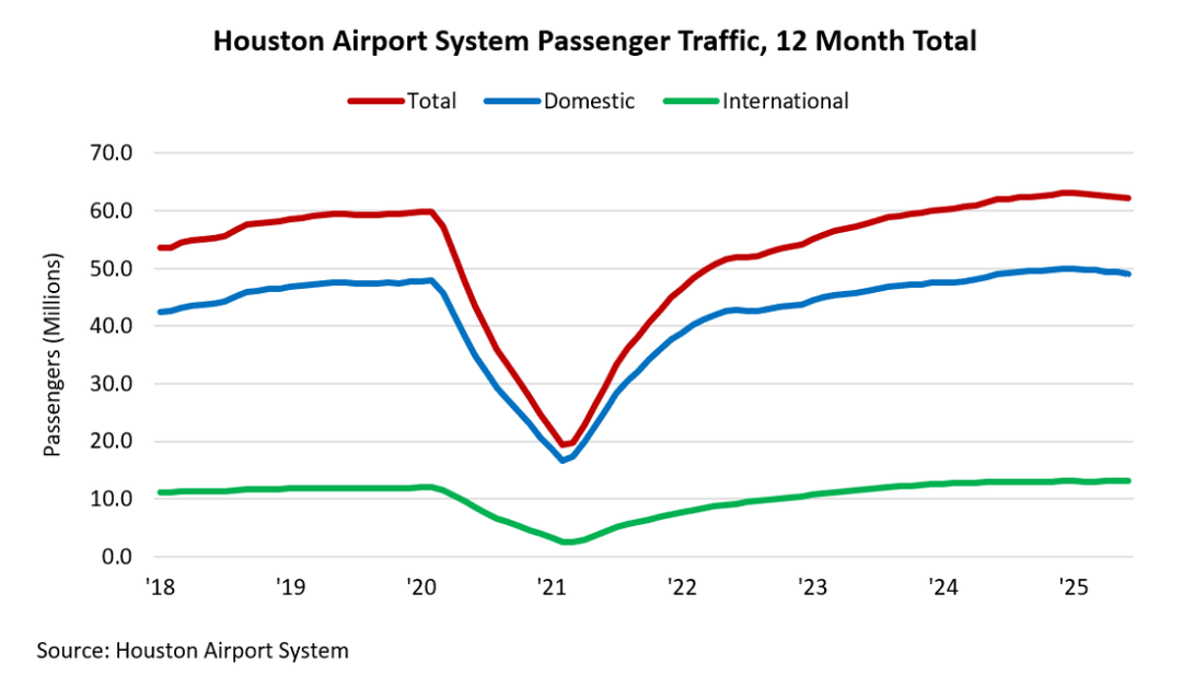 The Houston Airport System (HAS) handled 62.4 million passengers in the 12 months ending July ’25. That represents a 0.5 percent increase over the 62.1 million handled during the same period last year and a continued improvement over pre-pandemic levels of travel. Domestic and international travel accounted for 49.2 million and 13.2 million passengers, respectively.