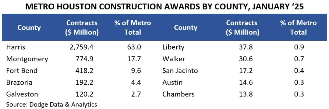 Dodge Data & Analytics reports that $43.8 billion in construction contracts were awarded in the Houston area in ‘24. That’s an increase of over 31 percent from the $33.3 billion awarded in ’23. January ’25 brought an additional $4.4 billion in new construction awards. While strong, January ’25 fell short of the $5.4 billion awarded in January ’24, the third-best month on record.