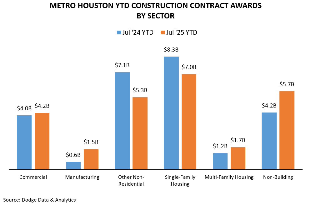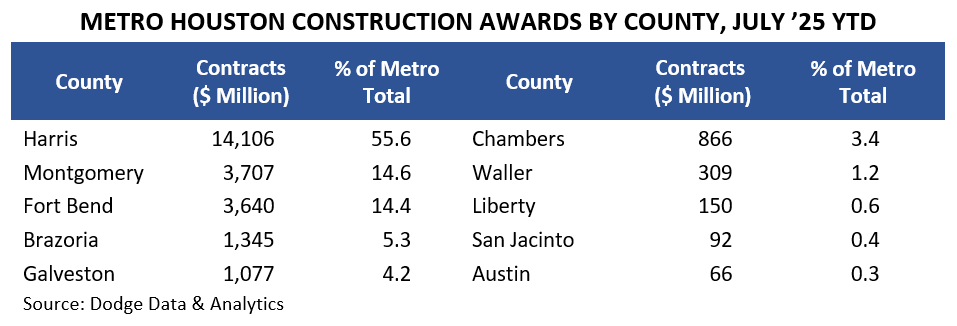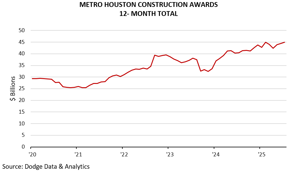 The value of construction contract awards in the Houston area reached $44.9 billion for the 12 months ending July ’25, according to reports from Dodge Data & Analytics. That’s an increase of 11.4 percent from the $40.4 awarded during the same period last year. July alone brought $3.8 billion in new construction awards, including $895.6 million for single-family homes and $501.2 million for offices and banks.