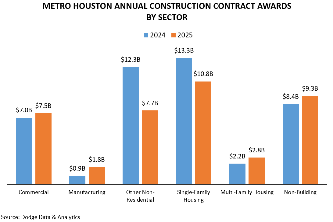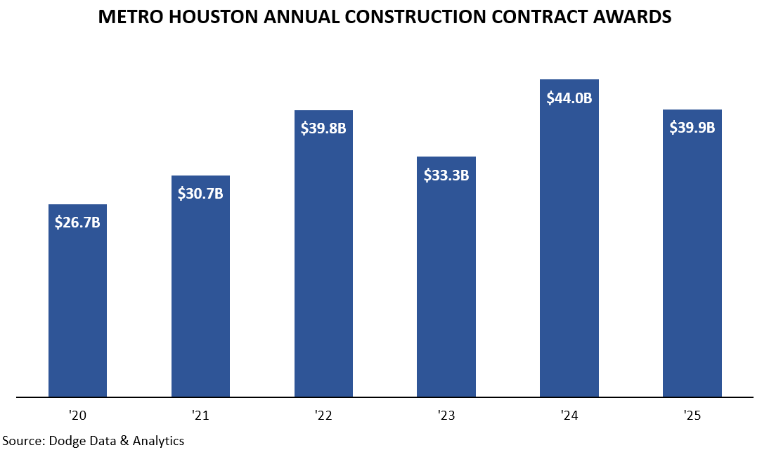 Greater Houston closed ‘25 with $39.9 billion in construction contract awards, according to reports from Dodge Data & Analytics. While that total was 9.4 percent below the all-time record set in ‘24, it still ranks higher than every other year on record, underscoring the region’s continued momentum. A surge in commercial and industrial contracts helped to offset a pullback in residential activity, which was led by weaker single-family home construction.