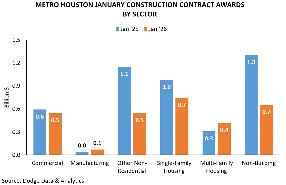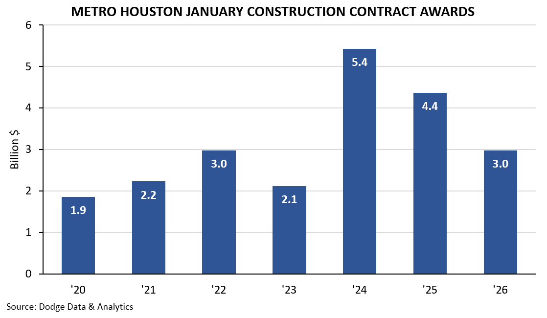 Following a healthy year of activity in ’25, Greater Houston opened ’26 with a softer January for construction contracts, according to reports from Dodge Data & Analytics. Roughly $3.0 billion in contracts were awarded in January ’26, down nearly one-third from $4.3 billion in January ’25. The year-over-year decline partially reflects the unusually high baseline in January ’25, when local governments awarded a large wave of infrastructure contracts to invest in roads and public water systems.