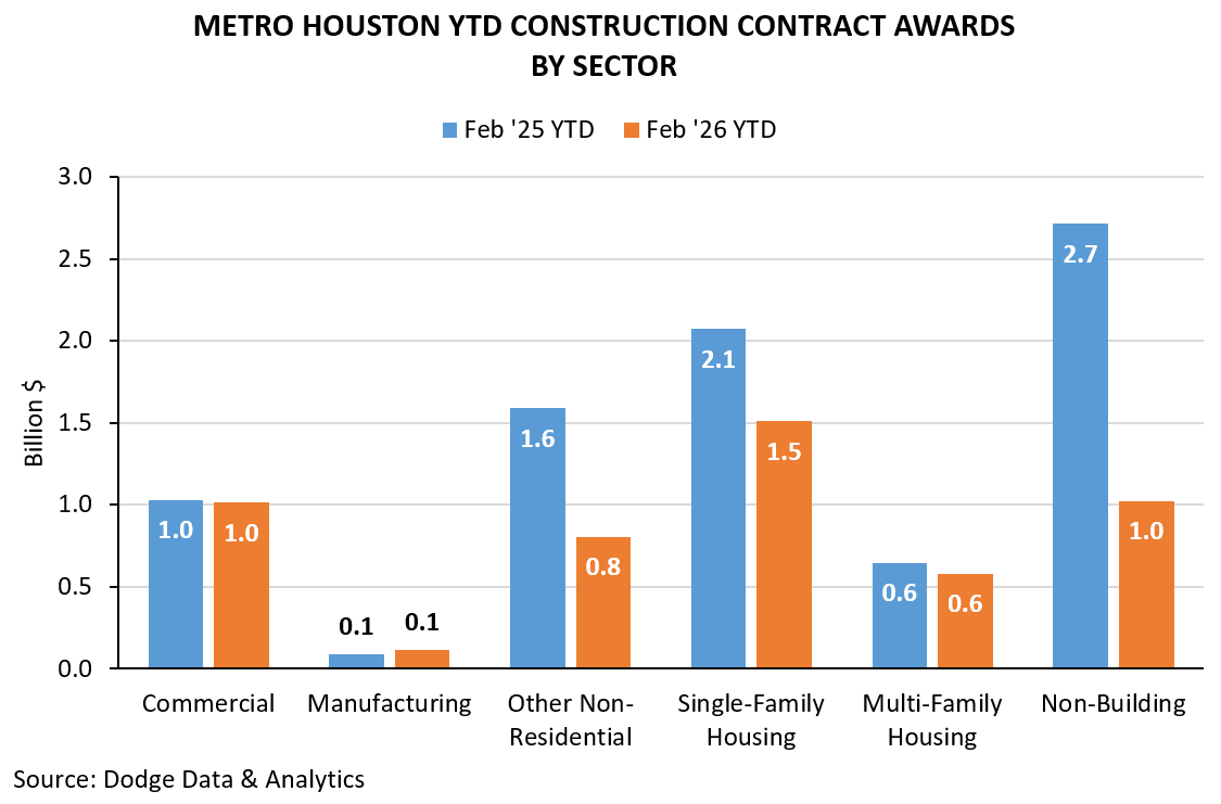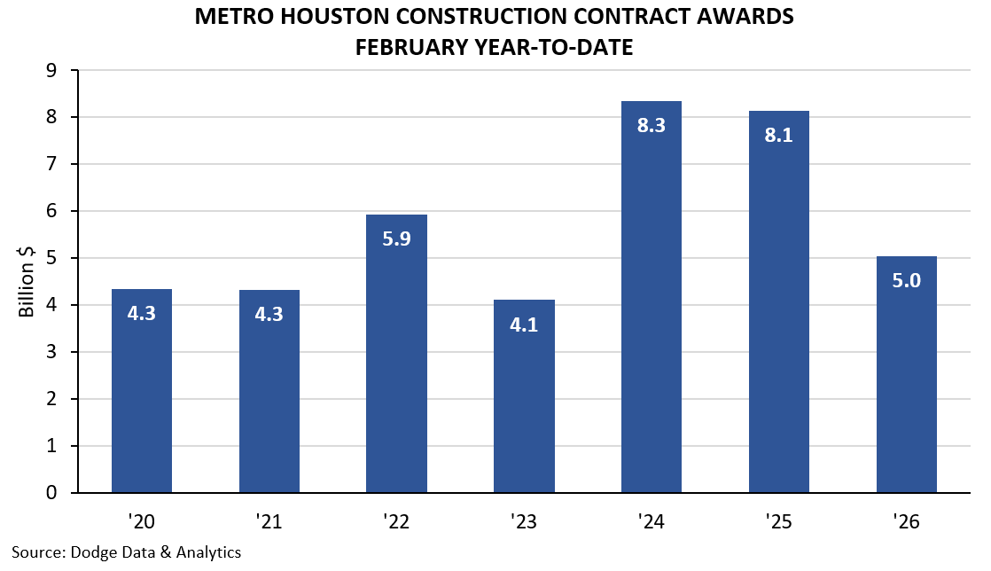 New construction awards in Greater Houston continue to normalize in ’26 after two exceptionally strong years of activity, according to information from Dodge Data & Analytics. About $5.0 billion in contracts were awarded year-to-date through February ’26, down 38.0 percent from the $8.1 billion awarded during the same period in ’25. Even so, activity remains healthy and sustainable, tracking broadly in line with the market’s typical range from ’20 through ’23. The elevated volumes seen in ’24 and ’25 were supported in part by a heavy concentration of major infrastructure awards. That surge has moderated in ’26, with non-building contract values down by roughly two-thirds through February relative to the same period last year.
