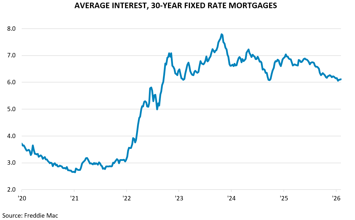 Mortgage rates were essentially flat in January and February, with the average rate on a 30-year fixed mortgage holding steady at 6.2 percent. That’s a meaningful improvement from the 7.0 percent recorded in January ’25, with potential buyers encountering a lower cost of borrowing.