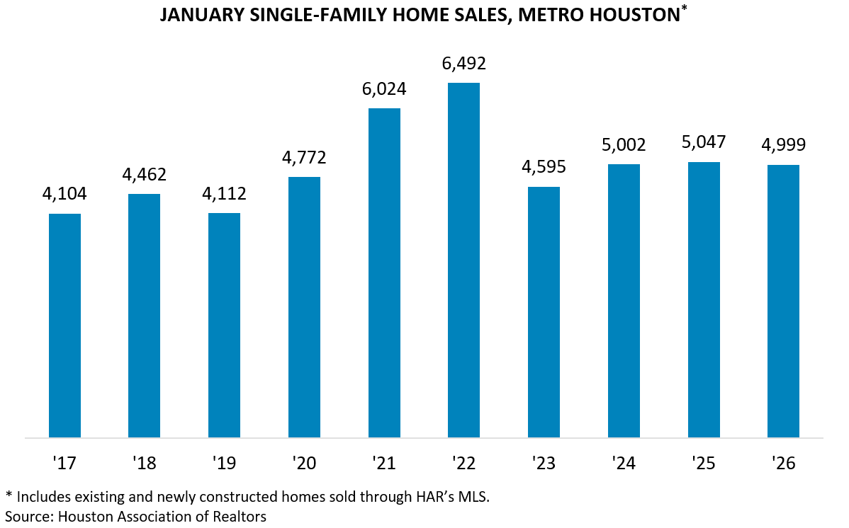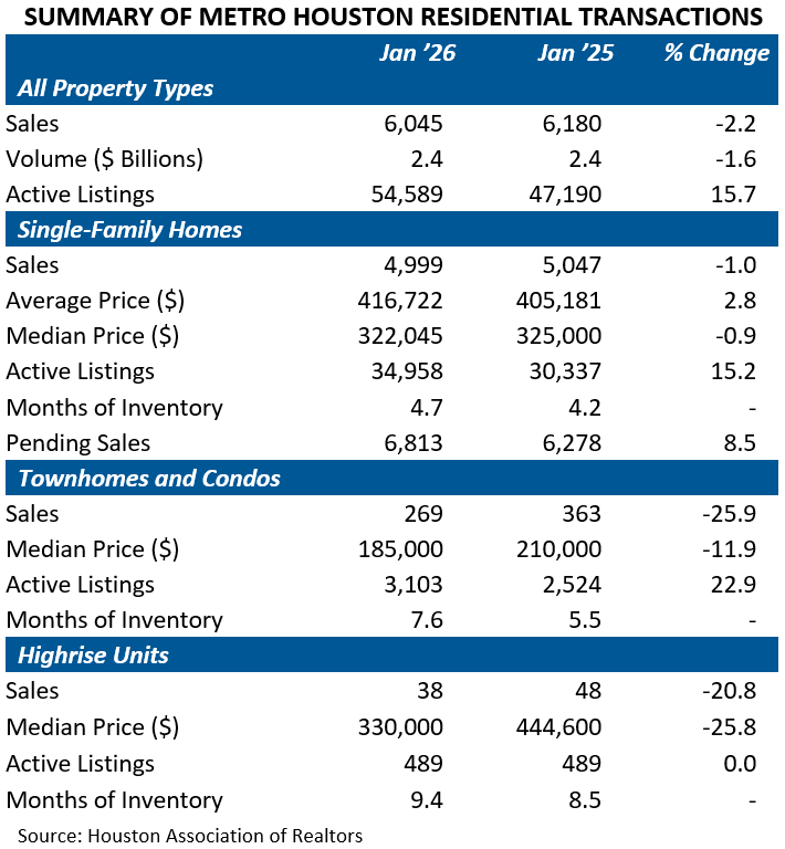 Brokers closed on 4,999 single-family homes in January ’26, according to the Houston Association of Realtors (HAR). That represents a minor 1.0 percent dip from January ’25, leaving sales in line with the pace of the past two years and still well above pre-pandemic norms. Sales of all property types declined by 2.2 percent over the same period due to softer demand for townhomes, condos, and highrise units.
