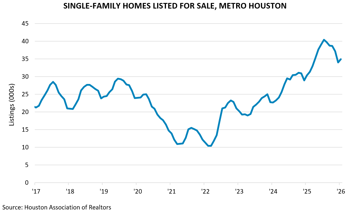 Active listings of single-family homes on the market edged up from roughly 34,000 in December to 35,000 in January. This reflects a typical seasonal bounce back from the lows of December, as many potential home sellers held off on listing their property until the end of the holiday season. Even with the increase, listings remained meaningfully below last July’s record of 40,000. If single-family homes were to continue selling at the current rate, it would take 4.7 months to sell the available inventory of homes on the market.