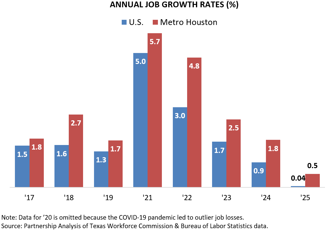 The benchmark revisions show Houston’s job growth rate in ’25 was 0.5 percent, up from the initial estimate of 0.4 percent. That still falls below the region’s long-term average of roughly 1.5 percent, reflecting a national macroeconomic environment that was marked by greater uncertainty and slower hiring. Even so, Houston outperformed the rest of the nation by a wider margin than first reported: at 0.5 percent, the region’s job growth rate was more than ten times higher than the national rate of 0.04 percent.