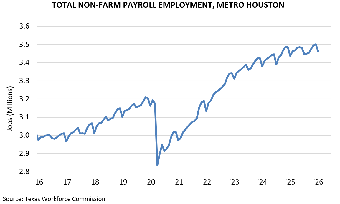 Alongside the ’25 benchmark revisions, TWC also released January ’26 employment estimates showing that metro Houston shed 41,000 jobs during the month. Seasonal job losses of that magnitude are typical as temporary holiday employment winds down and education positions tied to the fall semester taper off. This year’s drop of 41,000 was smaller than usual, with January averaging a decline of roughly 46,000 jobs over the past decade.