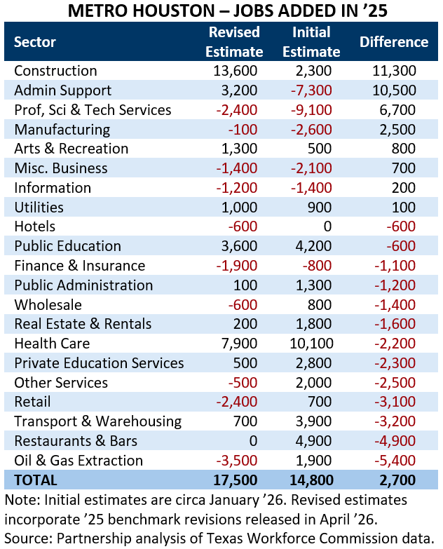 Metro Houston created 17,500 jobs in ’25, according to benchmark revisions released by the Texas Workforce Commission (TWC). That is stronger than the agency’s initial estimate of 14,800 jobs. The revised figures suggest Houston’s economy grew at a more robust pace last year than previously believed, as sizable upward revisions in construction, administrative support, and professional, scientific, and technical services more than offset weaker readings in sectors like oil and gas extraction and restaurants and bars.
