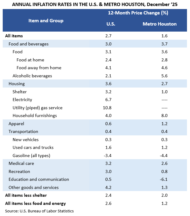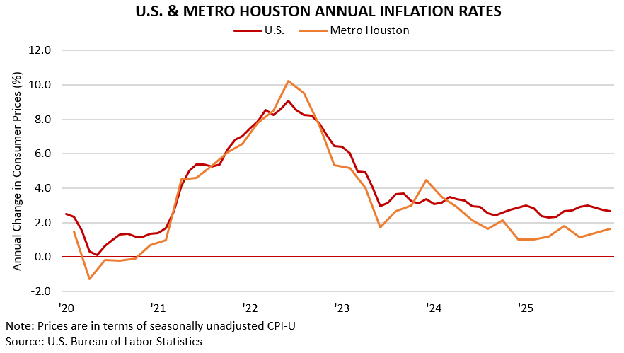 Inflation in the Houston region picked up in December, but it continued to run well below the national pace. Local consumer prices, as measured by the Consumer Price Index for All Urban Consumers (CPI-U), rose 1.6 percent between December ’24 and December ’25, up from 1.1 percent in August—the last month that local data was published before the government shutdown. Houston’s inflation rate remains more than a full percentage point lower than the U.S. rate of 2.7 percent, which was largely unchanged from November.