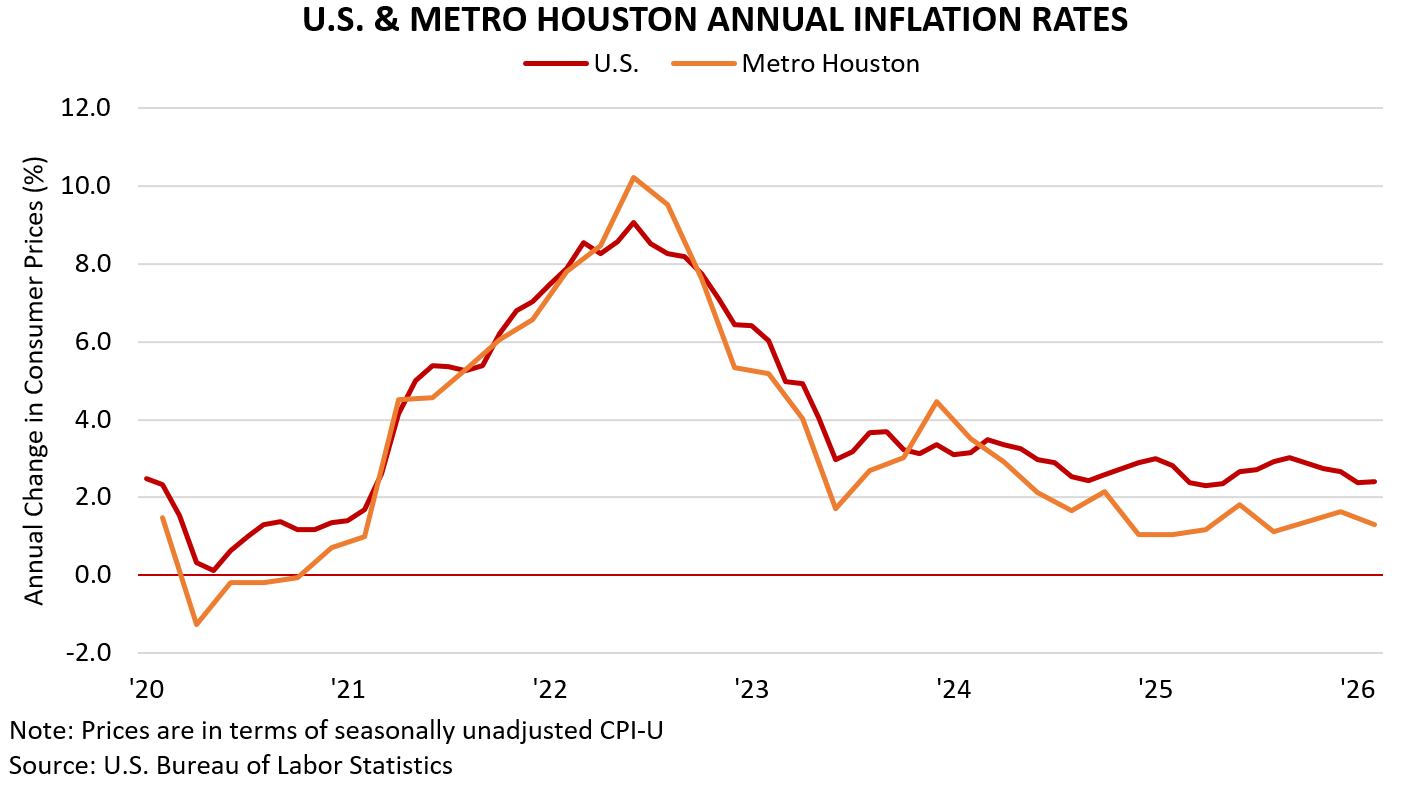 Inflation in the Houston region eased in February. Local consumer prices, as measured by the Consumer Price Index for All Urban Consumers (CPI-U), rose 1.3 percent between February ’25 and February ’26, down from the 1.6 percent annual increase recorded in December. By comparison, the national inflation rate held steady at 2.4 percent, putting Houston 1.1 percentage points below the U.S. average. Still, inflation could heat up in March as the conflict with Iran and closure of the Strait of Hormuz put upward pressure on oil and gasoline prices.