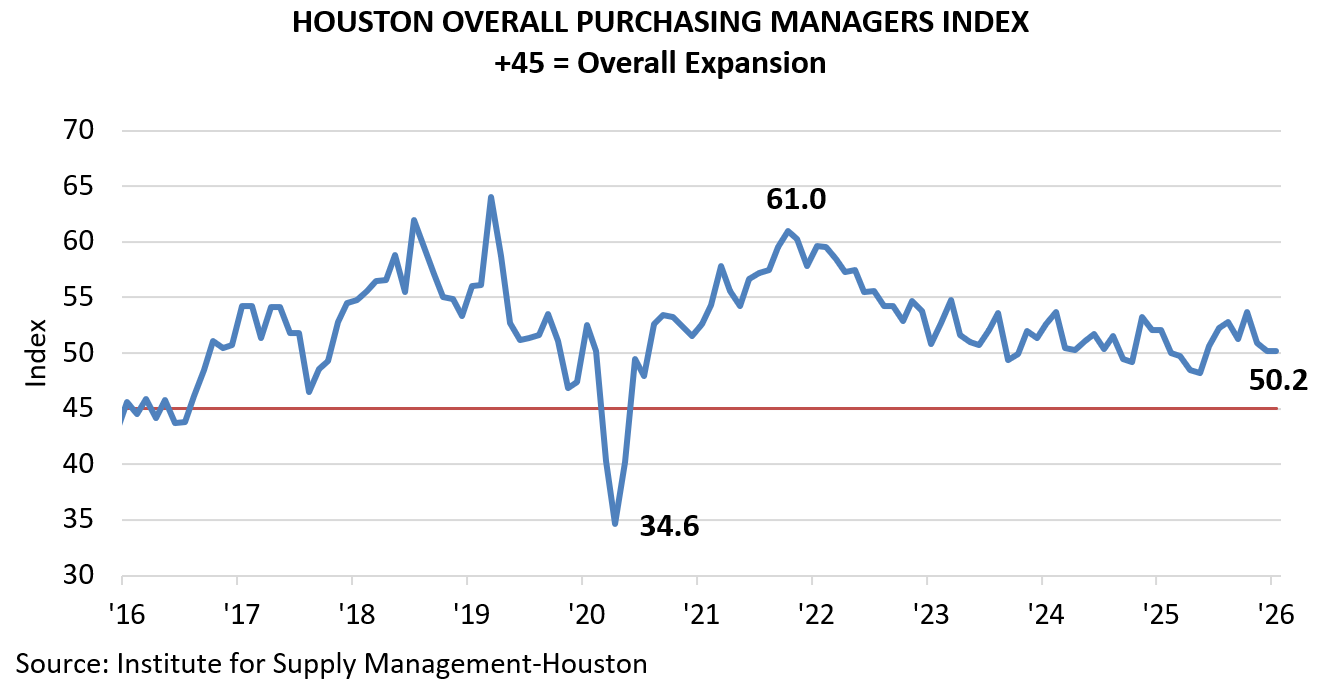 Houston’s economy continued to expand at a moderate pace in January, according to the latest Houston Purchasing Managers Index (PMI) from the Institute for Supply Management–Houston. The headline PMI, which gauges overall economic activity based on a survey of supply chain executives, held steady at 50.2 from December to January, extending the region’s expansion streak to 68 consecutive months. Manufacturing returned to growth for the first time since July, while non-manufacturing eased from modest expansion into modest contraction.