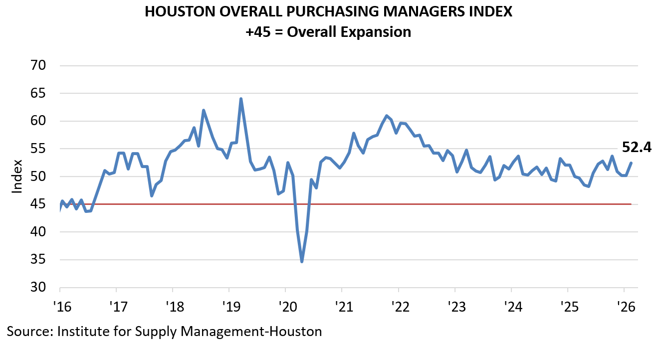 Houston’s economic growth accelerated in February, according to the latest Houston Purchasing Managers Index (PMI) from the Institute for Supply Management–Houston. The headline PMI, which gauges overall economic activity based on a survey of supply chain executives, increased to 52.4 in February from 50.2 in January, extending the region’s expansion streak to 69 consecutive months. Manufacturing and non-manufacturing both showed signs of growth with respective PMIs of 51.6 and 52.6.