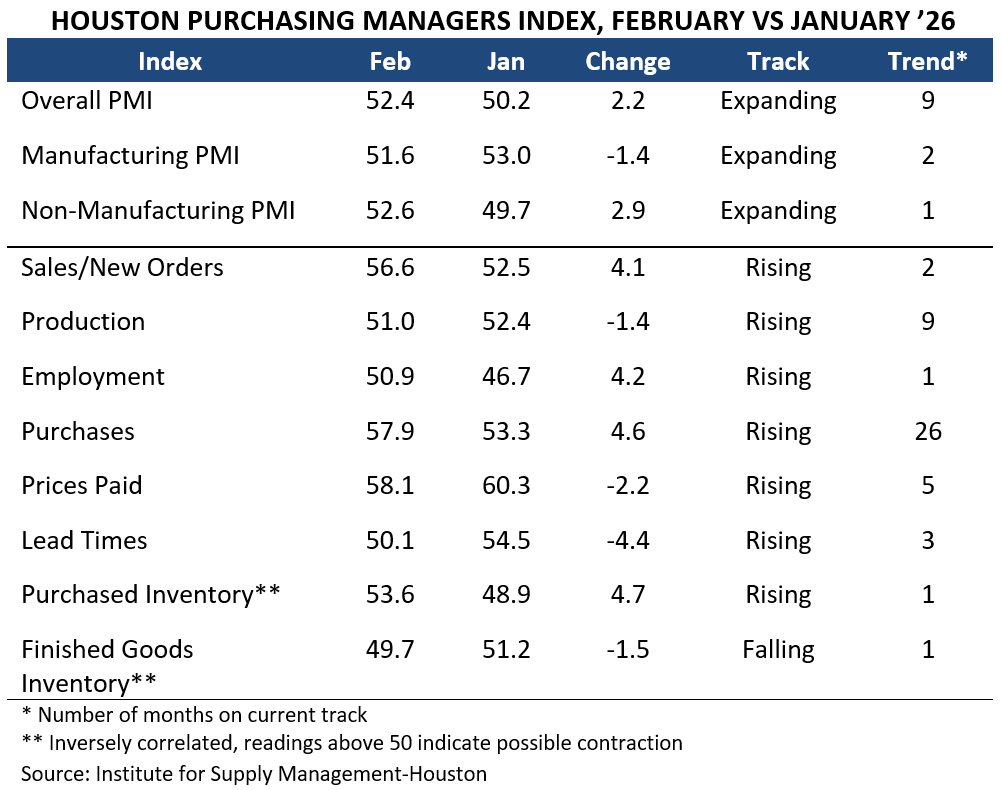 All three PMI components most closely linked to Houston’s growth signaled economic strength in February:
