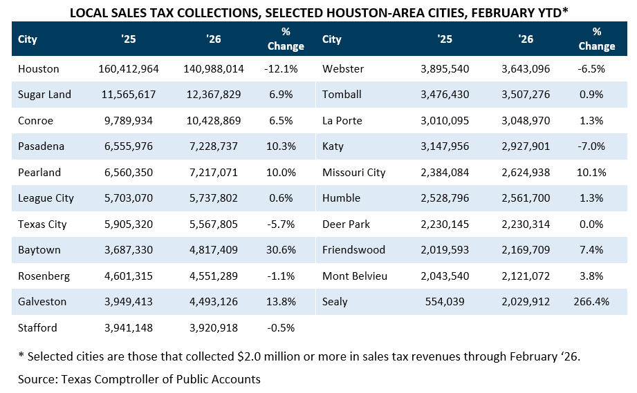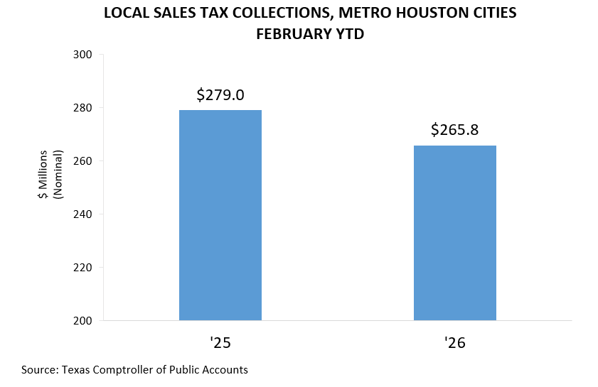 Sales and use taxes collected by the 123 Houston-area cities that collect them totaled $265.8 million during the first two months of ‘26, down 4.8 percent from the $279.0 million collected in the same period last year. Adjusted for inflation, collections are down 6.1 percent.