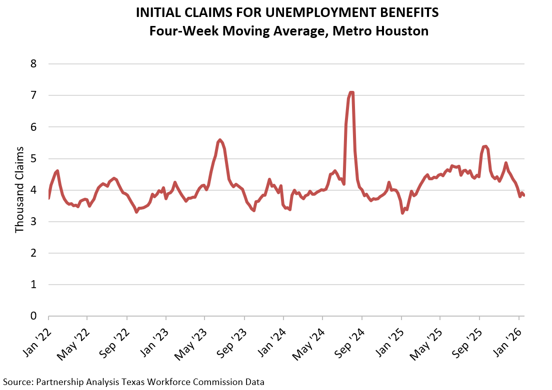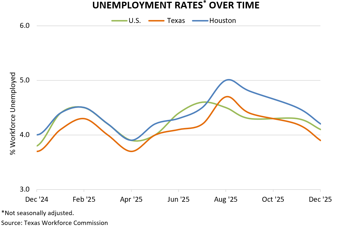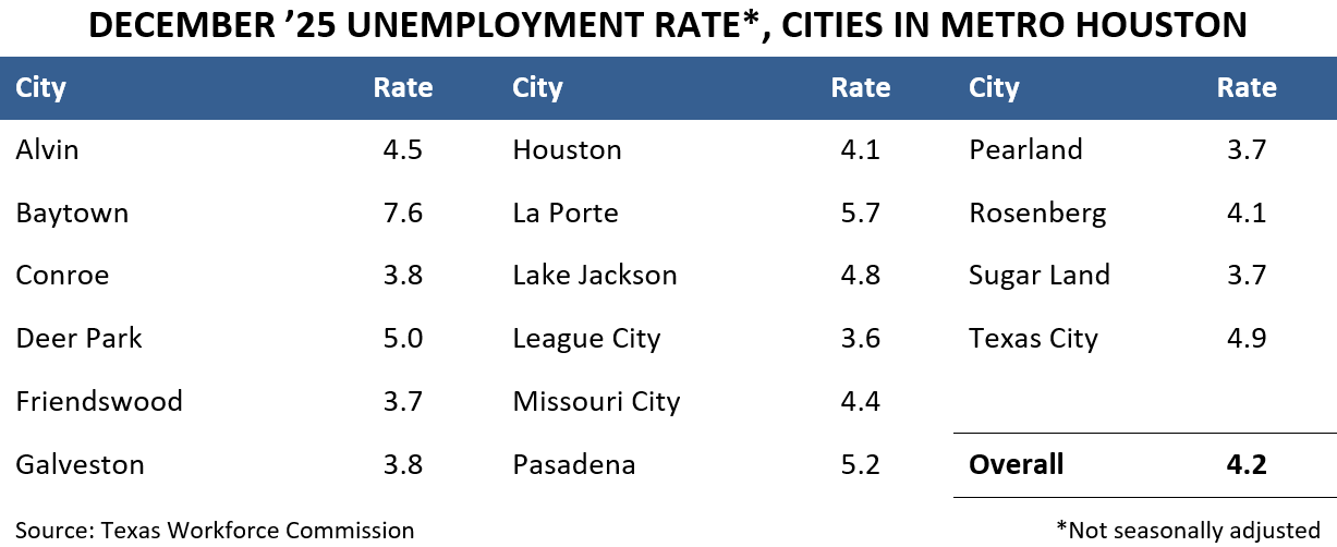 Metro Houston closed out ’25 with a 4.2 percent unemployment rate in December, according to data released by the Texas Workforce Commission. The local unemployment rate has retreated steadily from its 5.0 percent peak in August, including a 0.3-point drop from 4.5 percent in November. December marked the region’s lowest reading since May, though it remained slightly above the 4.0 percent reading a year prior in December ‘24. Houston’s unemployment still ran marginally higher than both the U.S. (4.1 percent) and Texas (3.9 percent).